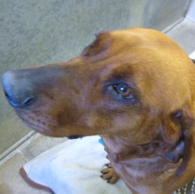 Gayle is a 1 ½ year old spayed female reddish brown Coonhound. She came to the shelter as a stray. She needs a home without other dog, cats or children. She has a sweet disposition and likes to go for walks. She needs a home where she will have enough room to run. She would benefit from additional training. Stop by today and visit her.