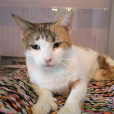 Skyfall is a 3 year old spayed female Calico kitty. She came to the shelter a stray. She likes other cats and is learning about dogs while with us. She is a little shy when you first meet her, but has a sweet personality. She loves to play with toys and enjoys sunny windows. She loves to sit on soft blankets and has extra toes on her feet. She would most likely do better in a quieter home. Skyfall is available through our Adult Companion Program to those who qualify.