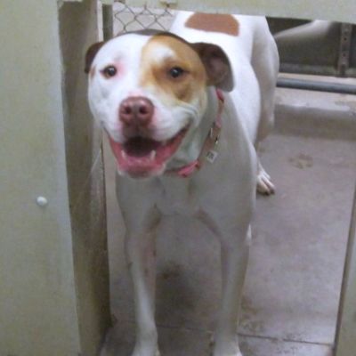 Bella is a 1 year old spayed female white and brown Pitt mix. She came to the shelter because her owner couldn’t spend enough time with her. She has a very sweet personality and is always happy. She must meet and resident dog and needs a home without cats. She knows how to walks on a leash and sit. She would benefits from additional training. Please stop by and visit her today. She’s a real sweetheart.